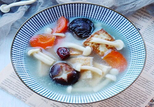 推荐理由:天气渐凉,来碗热呼呼的汤暖暖胃。菌菇是美食里不可缺少的主角,富含生物活性物质,味道也很鲜香。配合豆制品以及各种鲜蔬,给身体提供优质蛋白质,同时也是补充微量元素的能手。 准备食材:豆腐一块,蟹味菇100g,香菇3朵,胡萝卜半根,红枣2~3颗。 做法步骤:1、将豆腐切成大小...